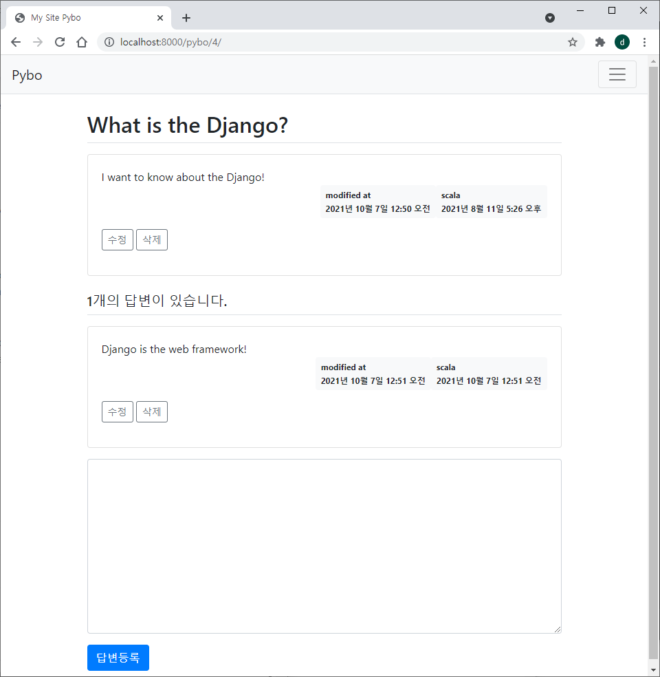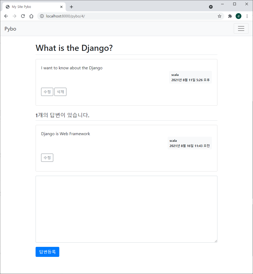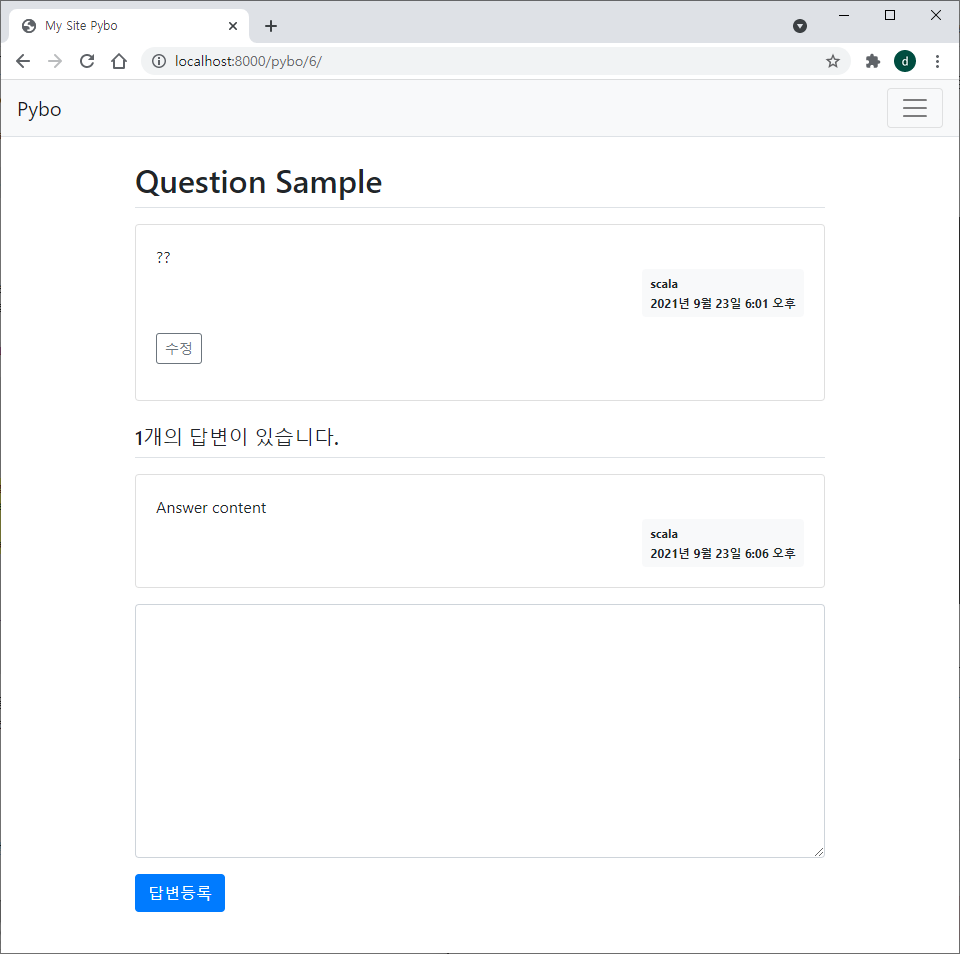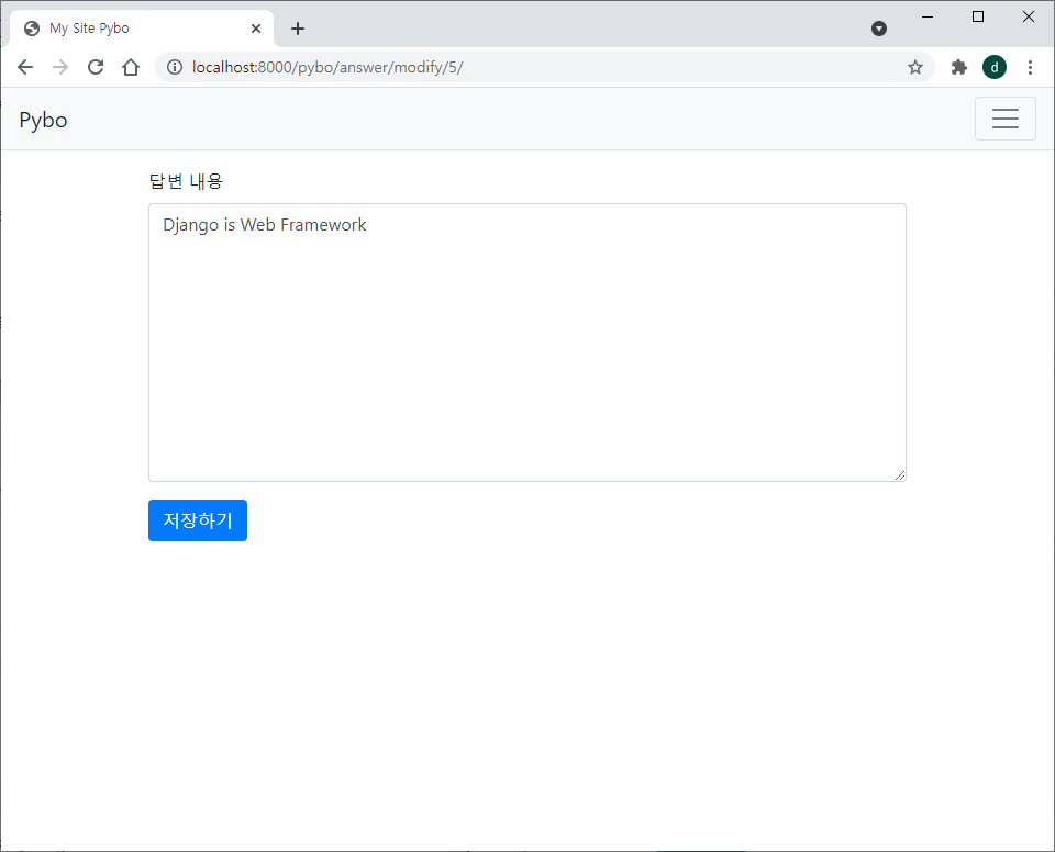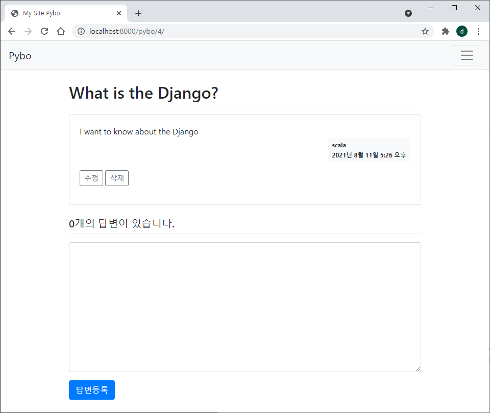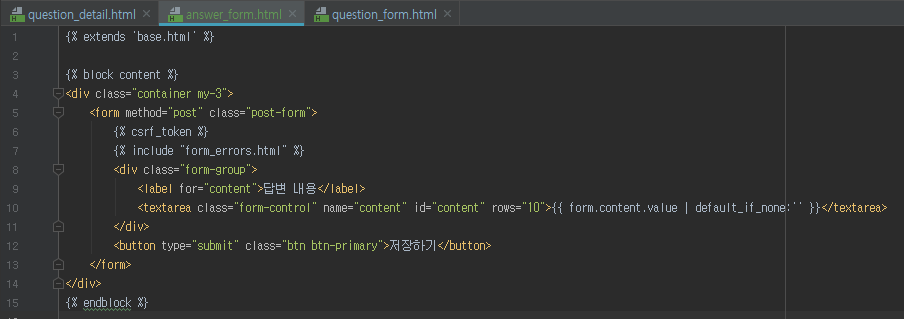 위와 같이 question_form.html 을 참조하여 answer_form.html 을 작성한다.