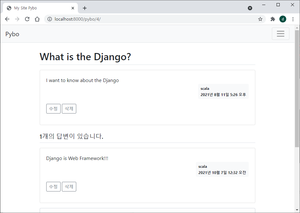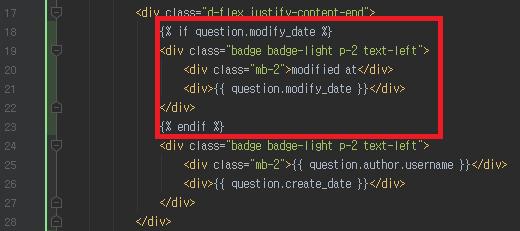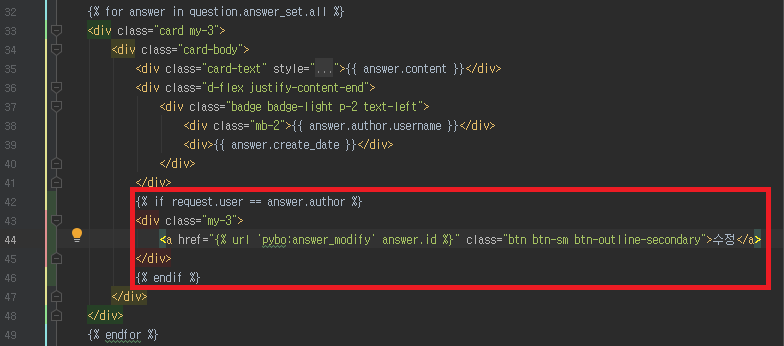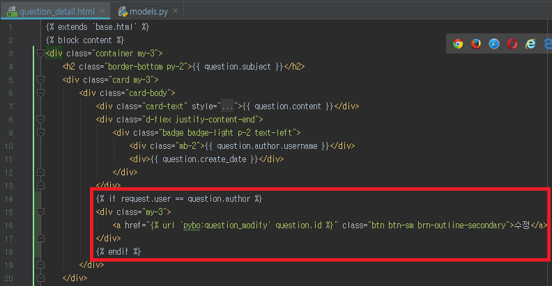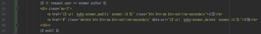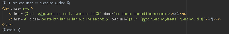 먼저 templates/pybo/question_detail.html 을 위와 같이 수정하여 로그인한 유저가 이 게시글의 작성자일 때에 한해서