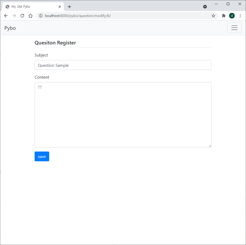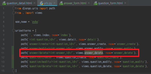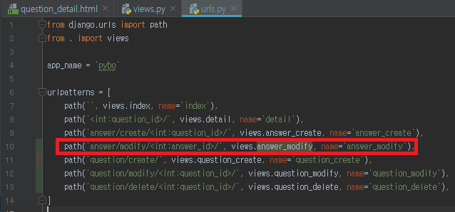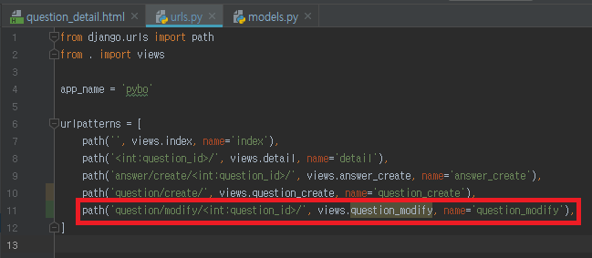 pybo/urls.py 에 위와 같이 pybo:question_modify 에 해당하는 url 매핑을 추가한다.