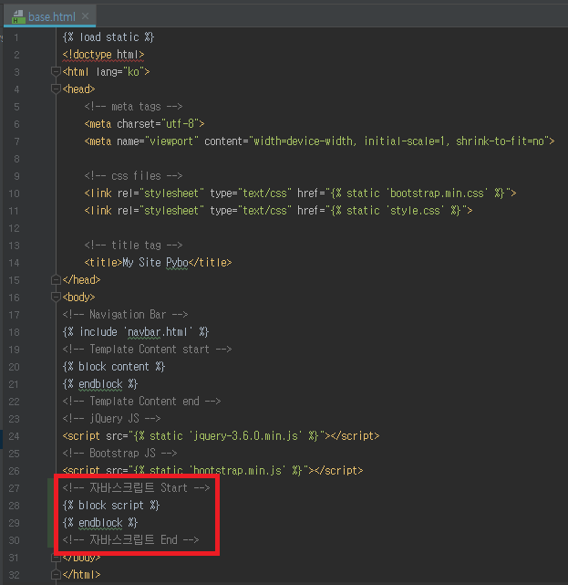 base.html에 포함시켜 두었다. base.html을 위와같이 조금 수정하여 자바스크립트의 호출이 반드시 jQuery 로드 이후에