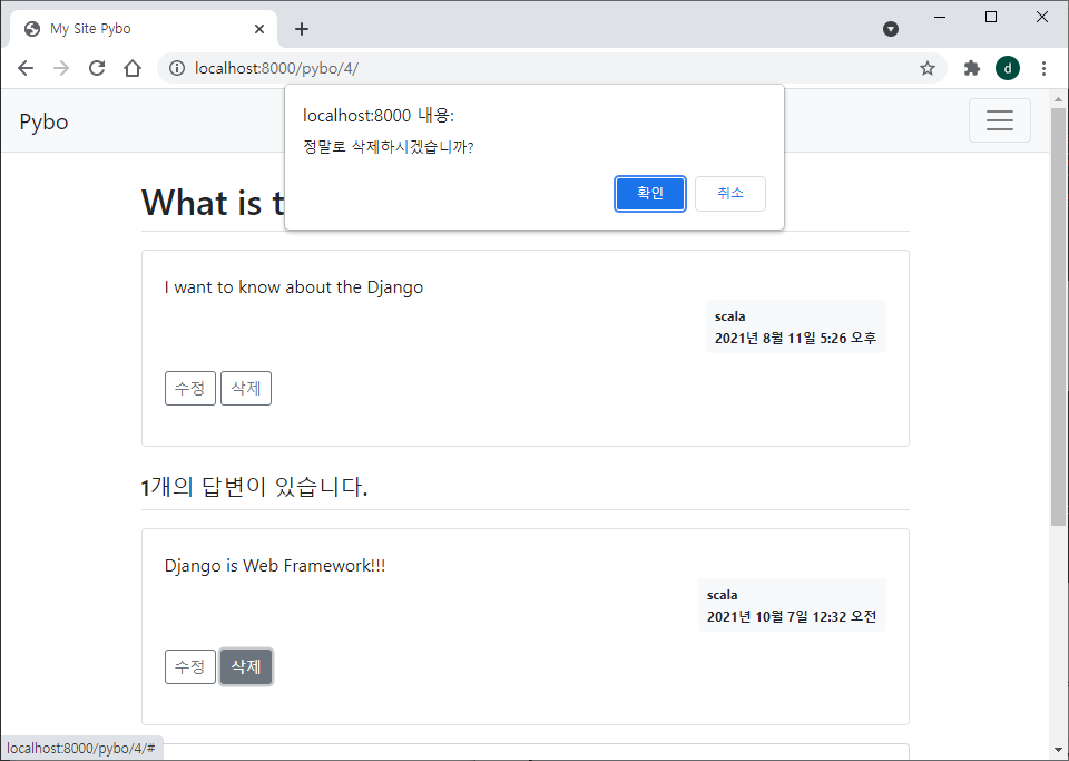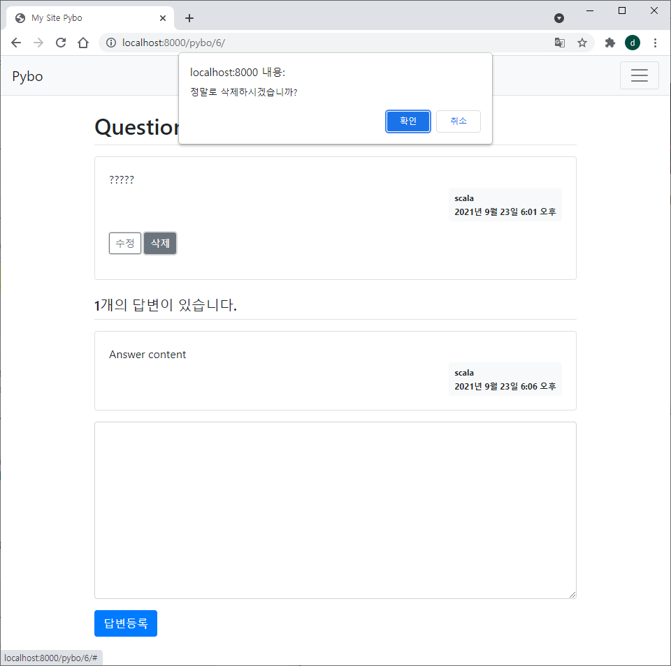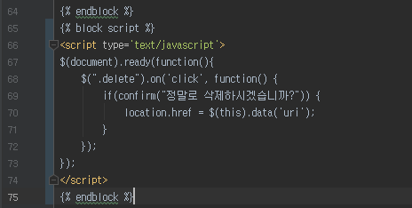 그리고 question_detail.html 에서 body 블록 아래에 script 블록을 추가하여 삭제를 확인하는 메시지가 뜨도록 한다.