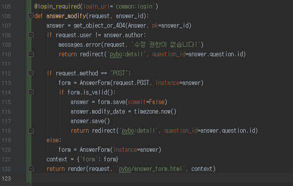 pybo/views.py 에 answer_modify 함수를 추가한다.