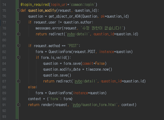 pybo/views.py 에 question_modify 함수를 추가한다. 비정상적인 접근을 대비해서 게시글 작성유저 본인이 맞는지