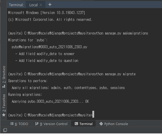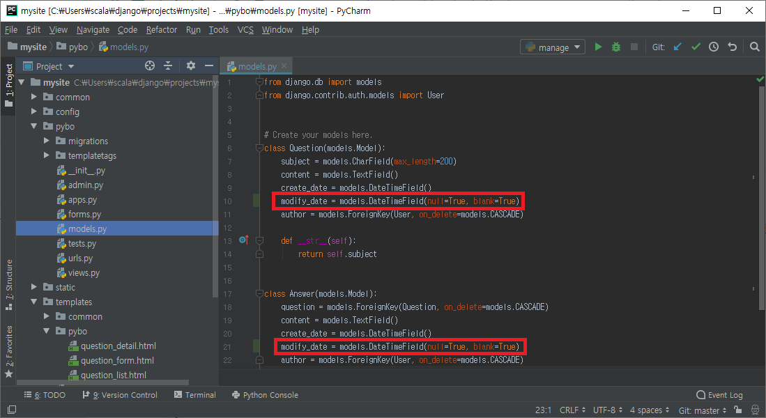 pybo/models.py 를 위와 같이 수정하여 게시글과 답글 모델에 modify_date 속성을 추가해준다. modify_date 는