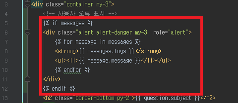 오류 메시지를 표시하기 위해 quesiton_detail.html 을 위와 같이 조금 더 수정한다.