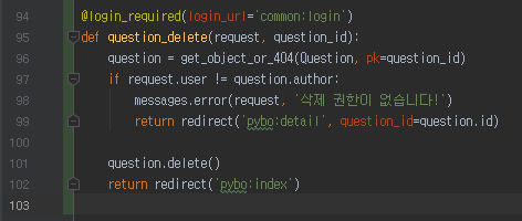 pybo/views.py 에 question_delete 함수도 구현해준다. 수정과 마찬가지로 유저 본인확인을 한번 더 진행한 뒤