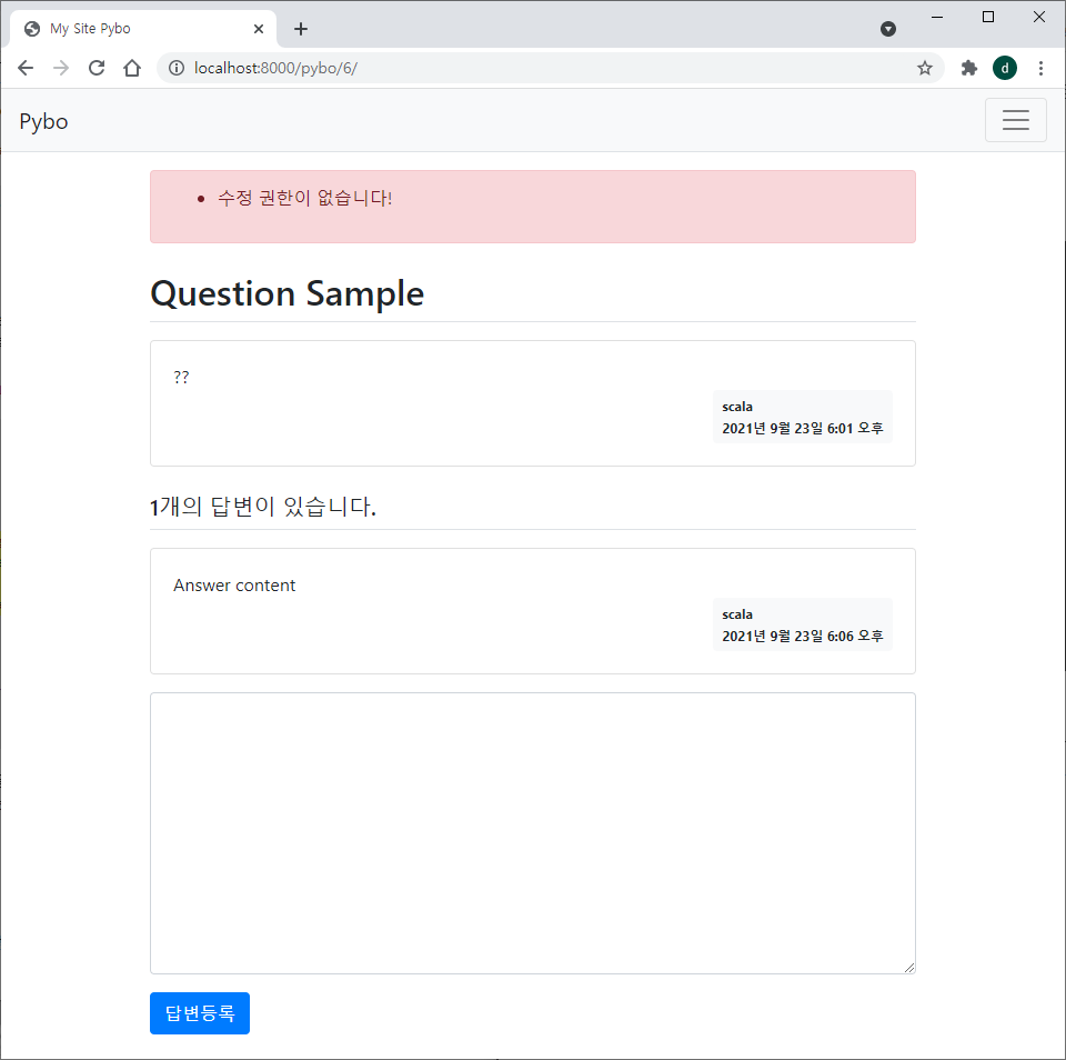 또한 url을 통해 비정상적으로 수정 페이지에 접근할 경우 수정 권한이 없다는 오류메시지를 띄우는 것도 확인 가능하다.