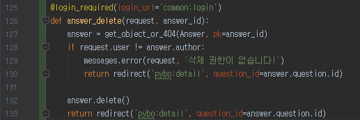 pybo/views.py 에 answer_delete 함수를 위와같이 구현한다. 삭제되면 index로 나가야했던 게시글과 달리
