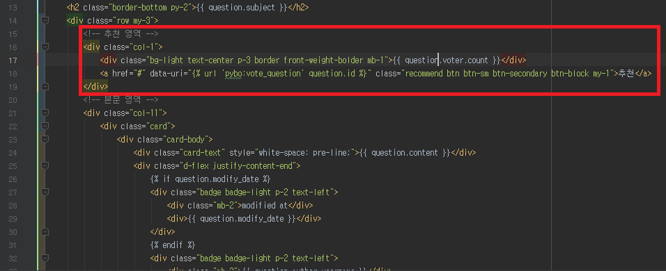 모델의 수정은 이미 게시글 추천을 구현할 때 마쳐두었기 때문에 바로 추천 영역을 만들어준다. 게시글 때와 완전히