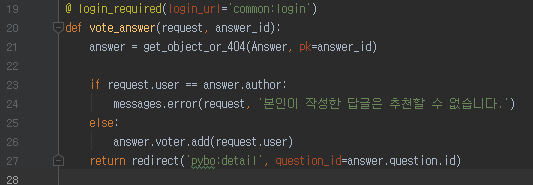 그리고 실제로 views 디렉토리에 vote_views.py 파일을 위와 같이 작성한다. 추천 또한 로그인한 사용자만이 게시글마다