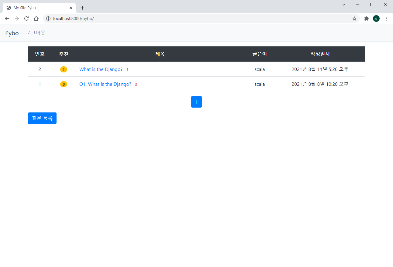 pybo/urls.py 에 url 매핑도 추가해준다.