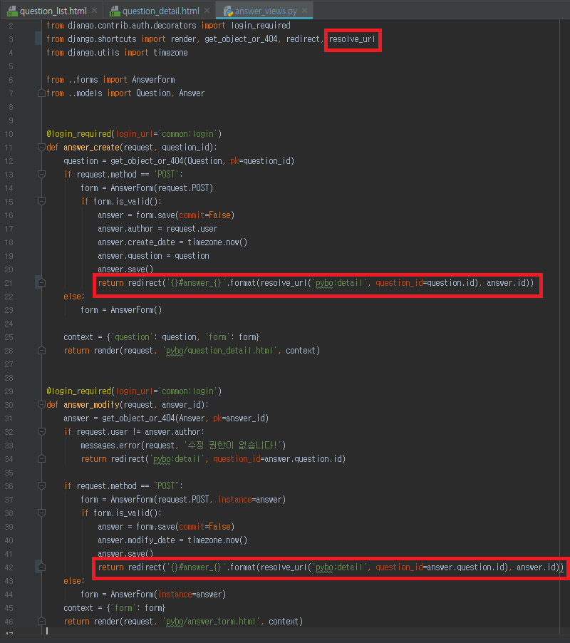 반환하는 함수이다. 그리고나서 redirect 되는 주소를 <게시글상세페이지 주소>/#answer_<작성/수정한 답글id> 의