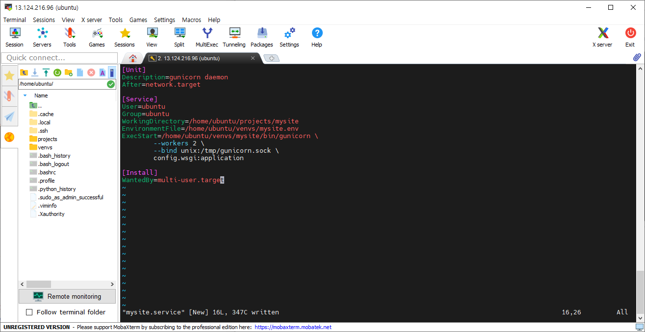 Gunicorn 은 운영을 위한 도구이기 때문에 서버 환경에 설치한다. MobaXterm 으로 AWS 서버에 접속하고
