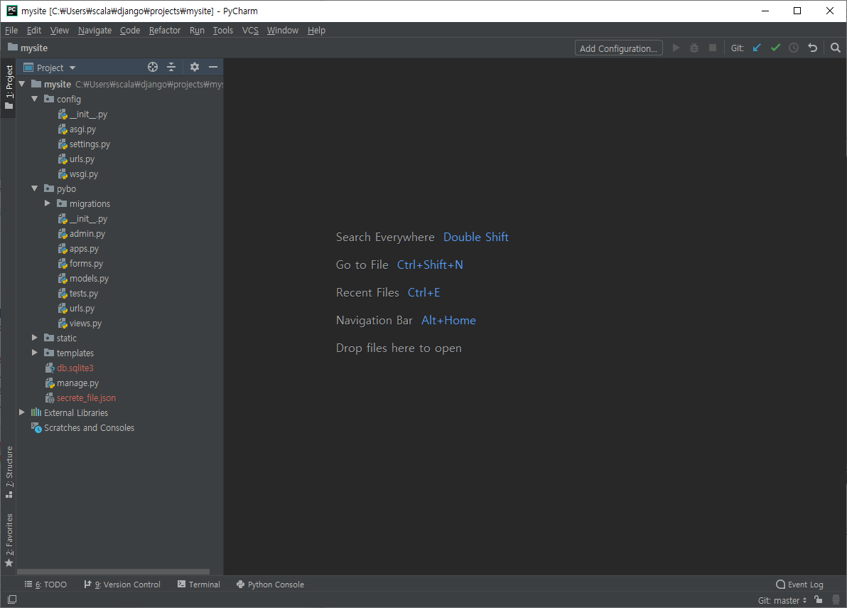 설치가 완료되면 위와같은 화면을 볼 수 있다. open 을 클릭하여 우리가 생성했던 django 프로젝트 디렉토리인 C:\projects\mysite 를 선택하면 PyCharm의 프로젝트 화면이 열린다. (위 스크린샷은 다른 경로에 만든 프로젝트이기에 경로가 조금 다르다.)