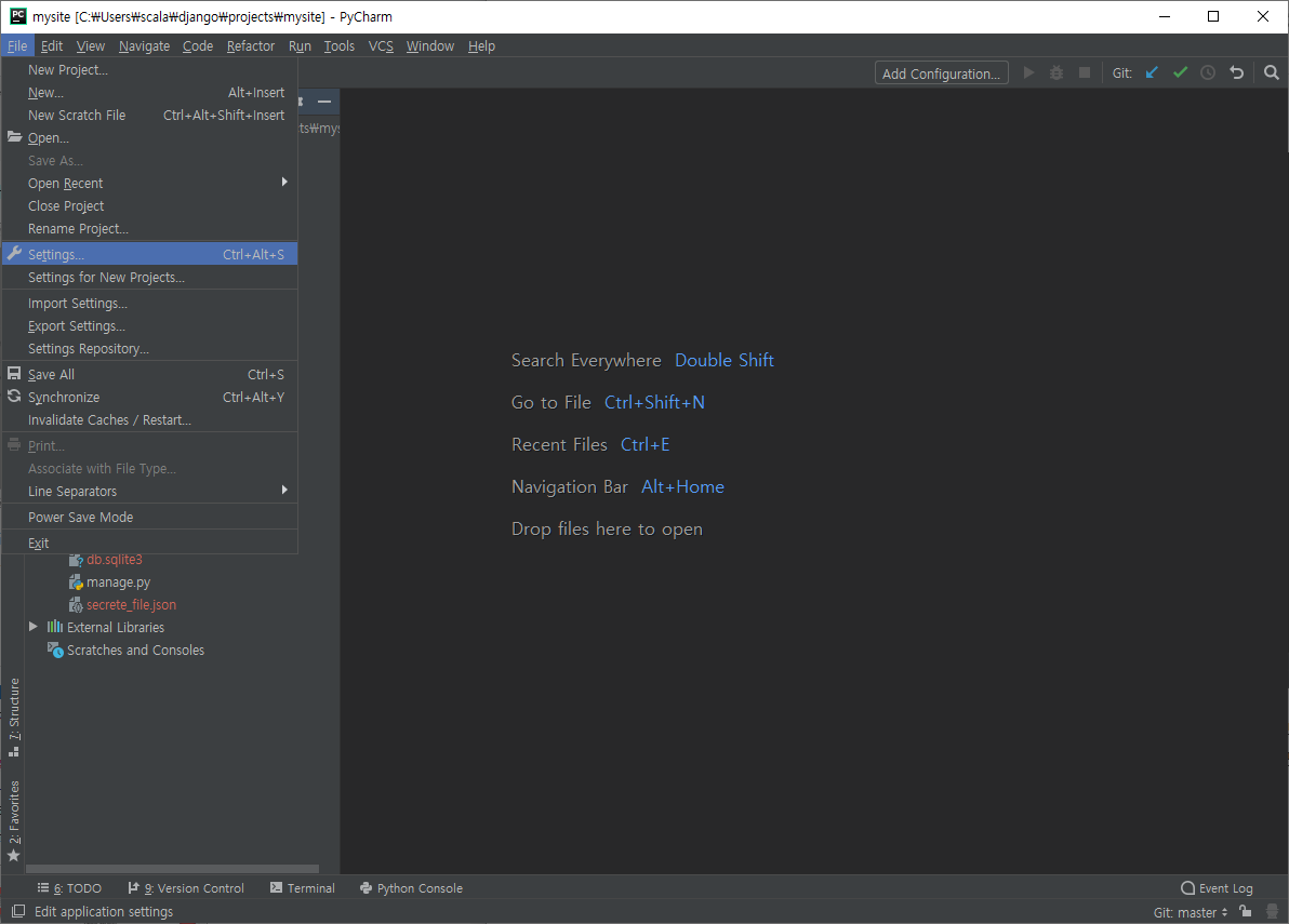 이제 Python 인터프리터를 잡아주기 위해 File > Settings 로 들어간다.