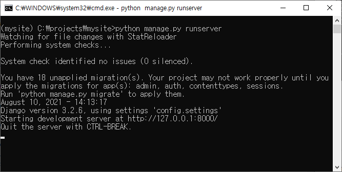 mysite 디렉토리 내부를 확인해보면 config 디렉토리와 manage.py 가 생성된 것을 확인할 수 있다. 생성된 디렉토리는 프로젝트의 설정파일 등이 생성되어 담겨있으며 manage.py 는 django로 개발한 서버를 구동하기 위한 파일이다. 명령문의 마지막에 붙은 . 은 현재 디렉토리에서 프로젝트를 시작한다는 의미이다.