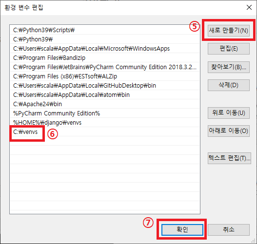 새로 만들기 버튼을 누르고 mysite.cmd가 존재하는 디렉토리인 C:\venvs를 추가해준 뒤 확인을 클릭, 환경 변수 창에서 한번 더 확인을 클릭하면 환경변수의 등록이 완료되었다. 이제 어느 디렉토리에서나 mysite를 실행하는것으로 바로 가상환경에 진입 가능하게 되었다.