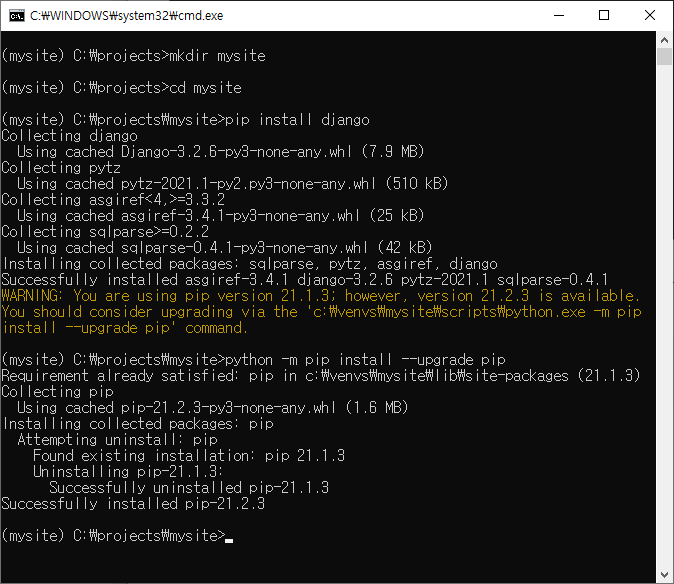 가상환경에 진입한 상태에서 이번에 진행하게될 프로젝트인 mysite의 디렉토리를 생성한 후 디렉토리에 진입한다.