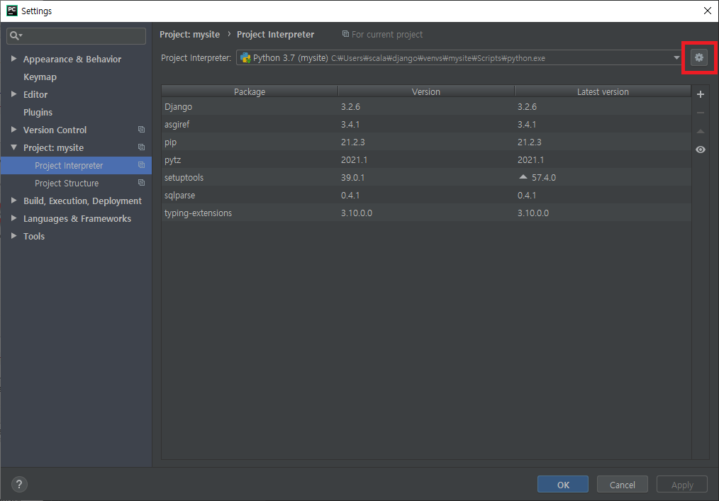 Project: mysite의 Project Interpreter 탭에서 우측 상단의 톱니바퀴 모양 버튼을 클릭한 뒤 Add 를 클릭한다.