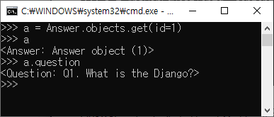 조회 또한 같은 방식으로 하면 된다. Answer 데이터에는 question 속성이 연결되어있기 때문에 어느 질문에 대한 답인지도 확인 가능하다. 그렇다면 Question 데이터를 가지고있을 때 그에 대한 Answer 데이터들을 조회하는 것도 가능할까?