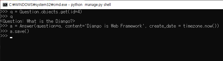 pybo\models.py 에 정의된 Question 과 Answer 모델(클래스), timezone 모듈을 import 한 뒤 Question 모델의 인스턴스를 하나 만들어본다. timezone 은 생성시간을 넣어주기 위해 사용하였다. q.save()를 실행하면 데이터베이스의 Question 모델 인스턴스 리스트에 추가된다. 이 때, q.id 를 출력해보면 어떤 숫자가 나오는데, 이 id는 인스턴스가 생성될 때 마다 자동으로 생성/부여되는 고유키이다. 필자의 경우 기존에 3개의 Question 인스턴스가 저장된 상태이기에 새로 생성한 질문의 id는 4가 되었다.