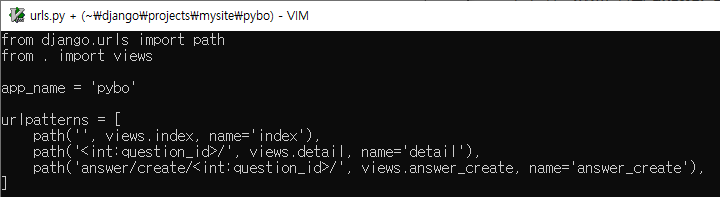pybo/urls.py 에서 다음과 같이 url 매핑을 추가한다.