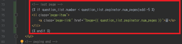 작은 경우 끝 페이지로 이동하는 링크가 나타나도록 한다. 총 페이지 수는 <page오브젝트>.paginator.num_pages 로