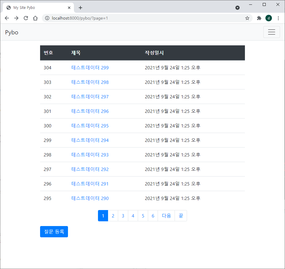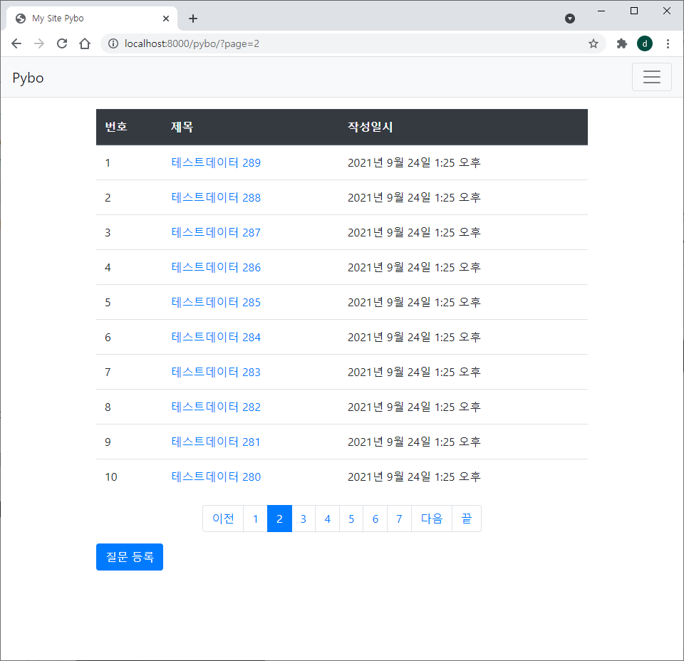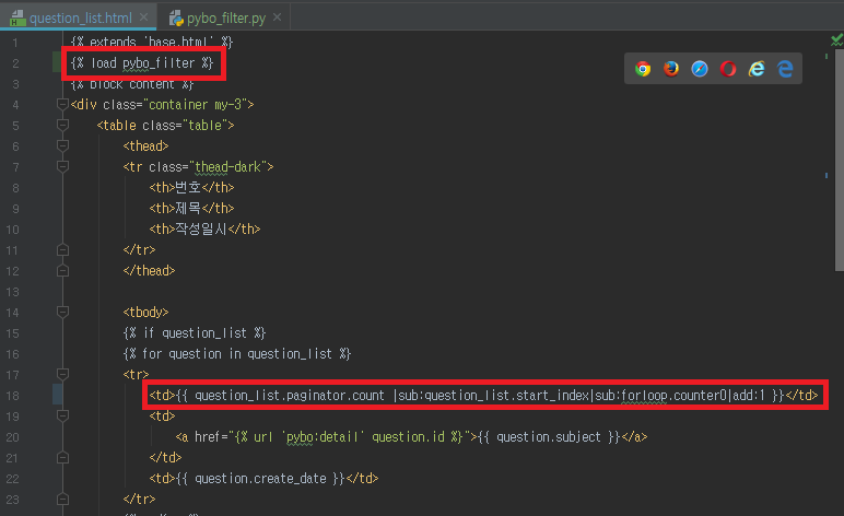 이제 question_list.html 에서 위와 같이 pybo_filter 파일을 추가하고 sub 태그와 add 태그를 사용하여 게시물 번호를