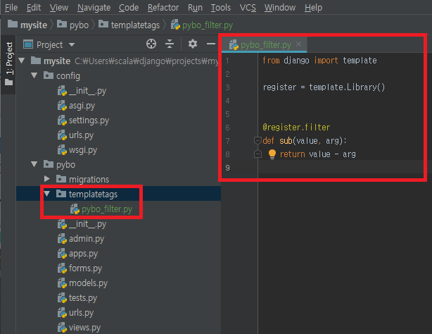 먼저 pybo 앱 디렉터리 하위에 템플릿 필터 파일을 저장할 templatetags 디렉터리를 생성한다.
