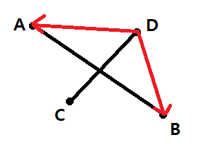 이번엔 교차하지 않는 선분 AB와 CD를 보자. 선분 AB를 기준으로 CCW(A, B, C) 와 CCW(A, B, D)는 각각 시계방향, 반시계방향으로 반대의 방향성을 가지지만 선분 CD를 기준으로 CCW(C, D, A) 와 CCW(C, D, B) 를 보면 둘 다 반시계 방향으로 같은 방향성을 가진다.
