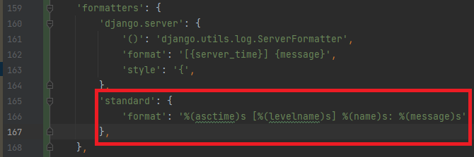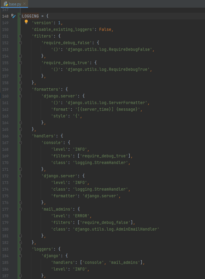 먼저 위에서 살펴본 DEFAULT_LOGGING 설정을 변수명만 LOGGING 으로 바꾸어 config/settings/base.py 에 추가해준다.