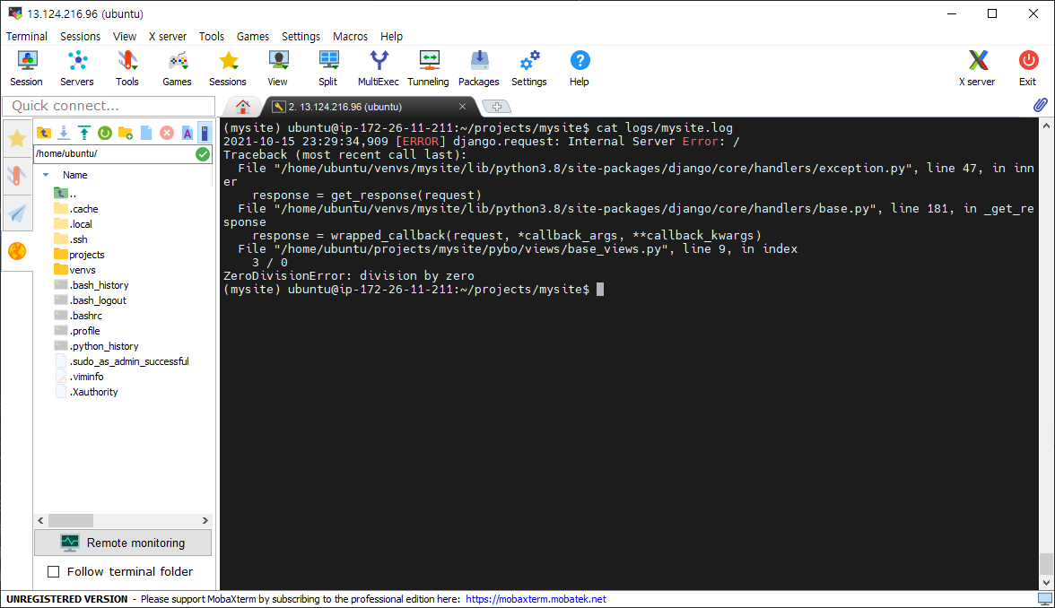 500 에러가 발생한 것을 확인할 수 있다. 이제 로그 파일을 확인해보자.