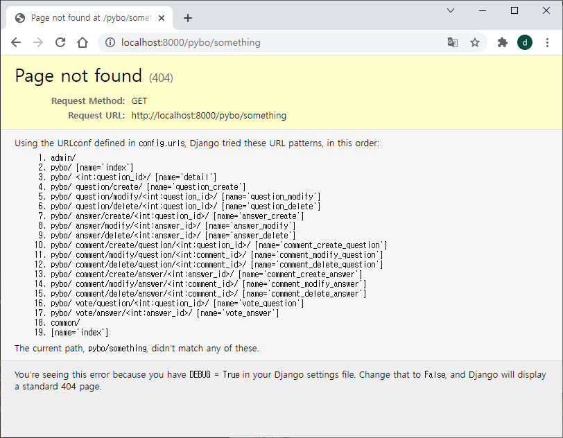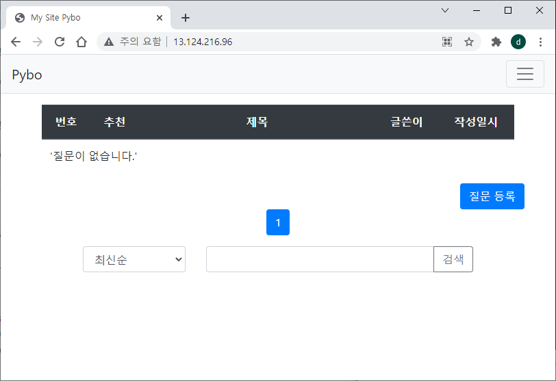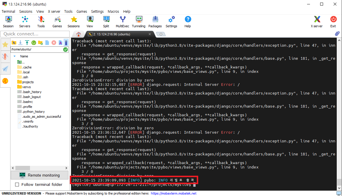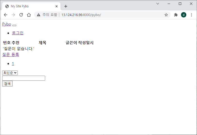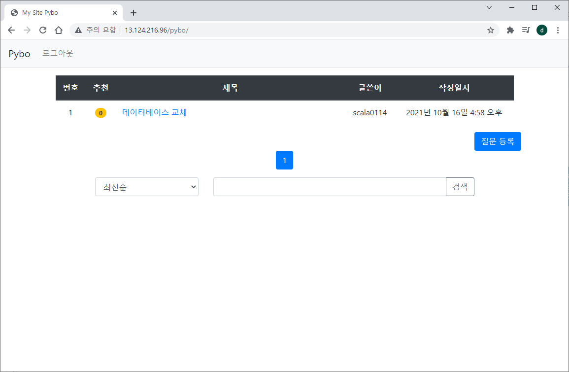 먼저 pybo 에 접속한 뒤에 로그를 확인해보면 출력한 로그가 제대로 쓰여진 것을 볼 수 있다.