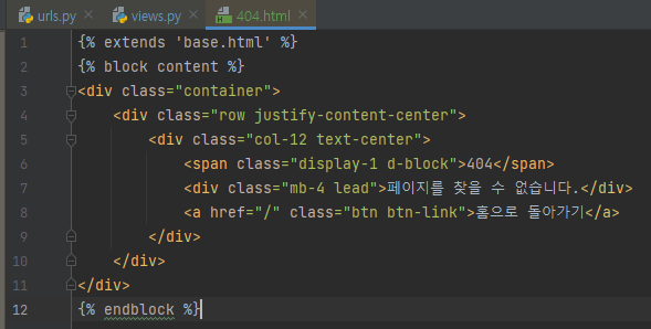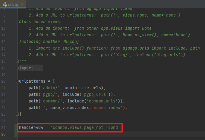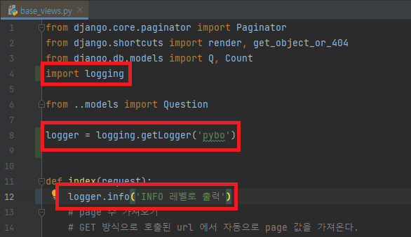 pybo/base_views.py 를 위와 같이 수정한다. logging 모듈을 import 하여 pybo 라는 로거를 통해 원하는 레벨의