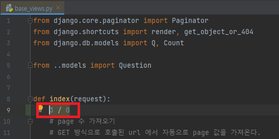 pybo/base_views.py 의 index 함수에서 3 / 0 으로 인해 ZeroDivisionERror 가 발생했음을 기록한 것을 볼 수 있다.