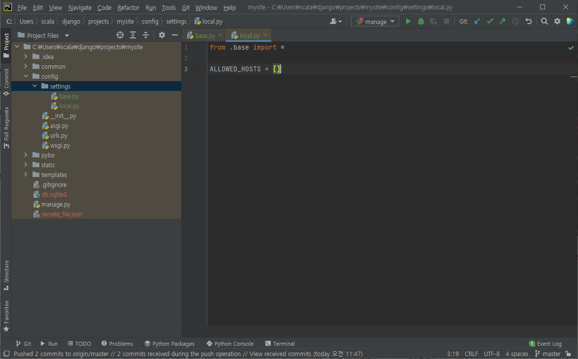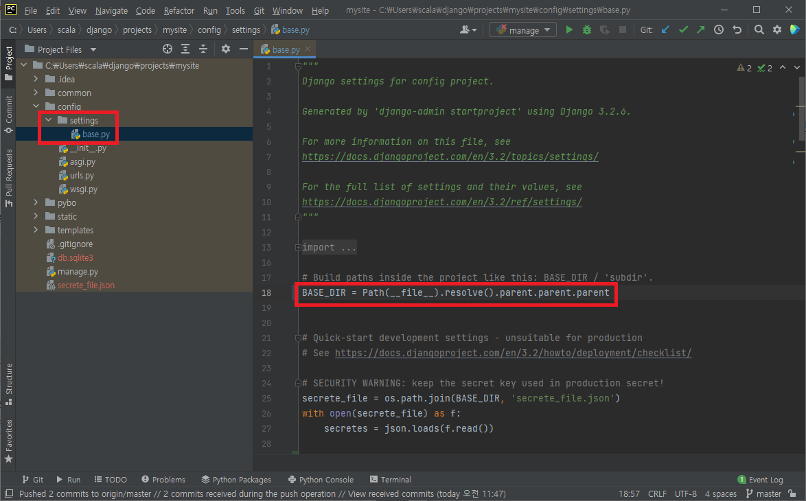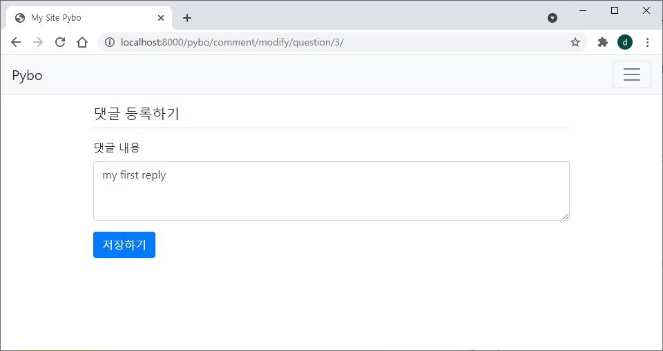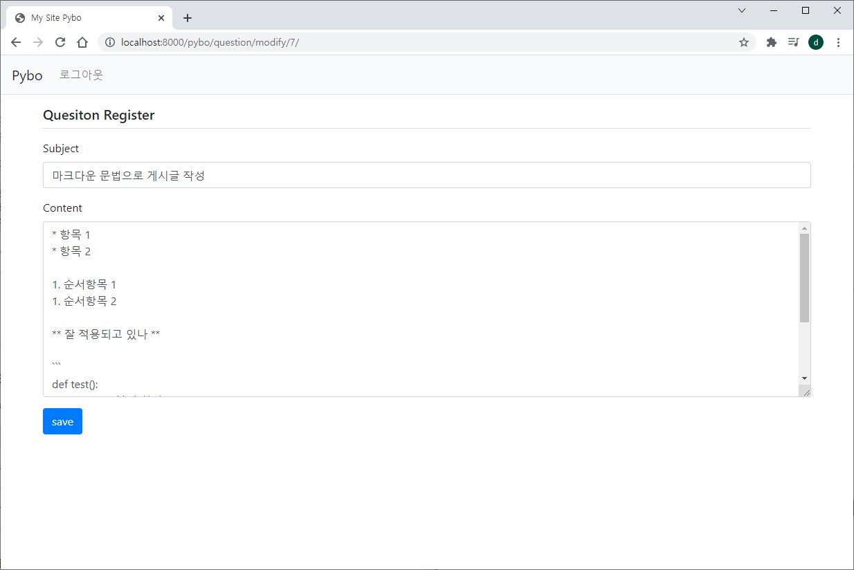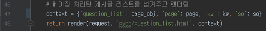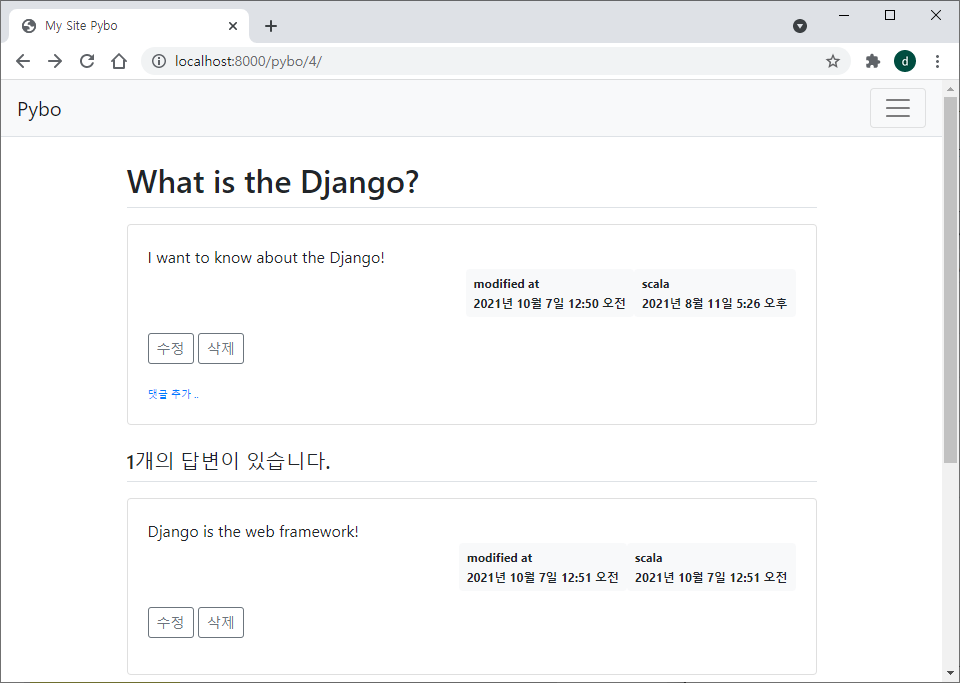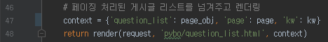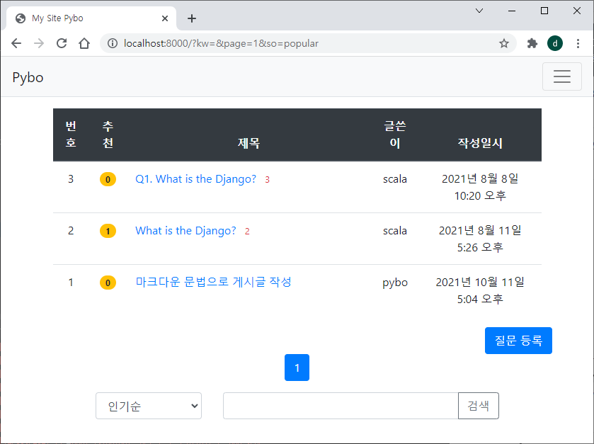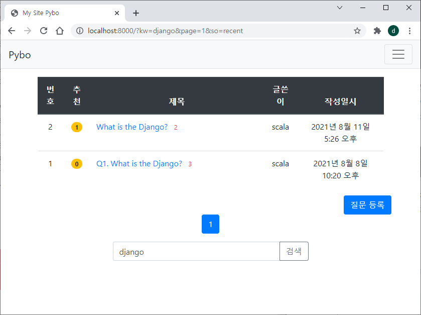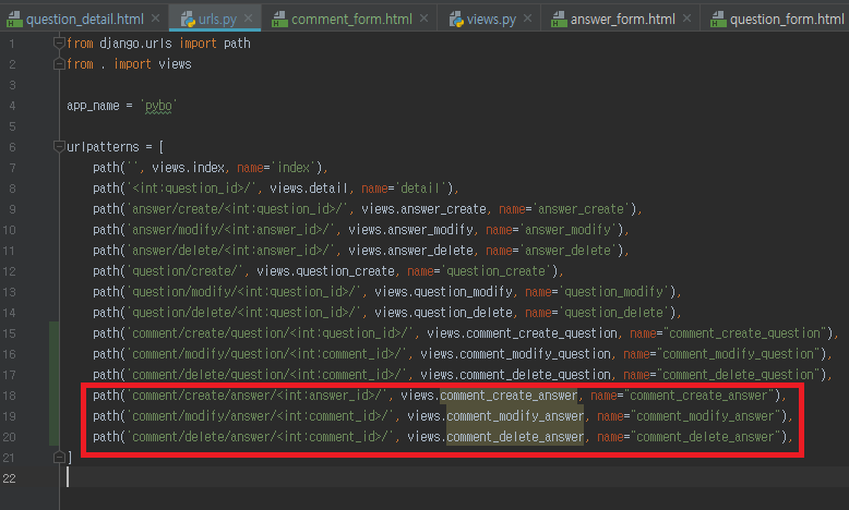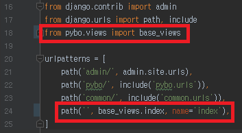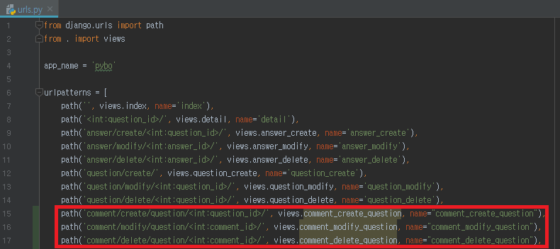pybo/urls.py 에 url 매핑도 추가해준다.