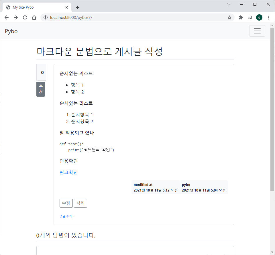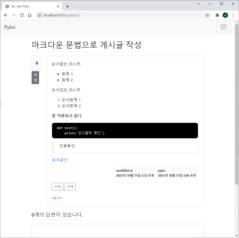 이제 게시글 본문 옆에 받은 추천 수와 추천 버튼이 생겼음을 확인할 수 있다.