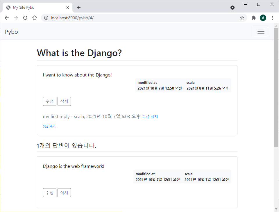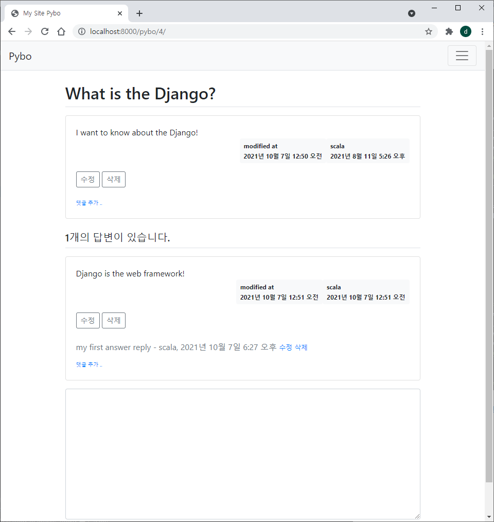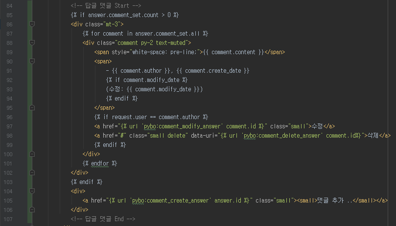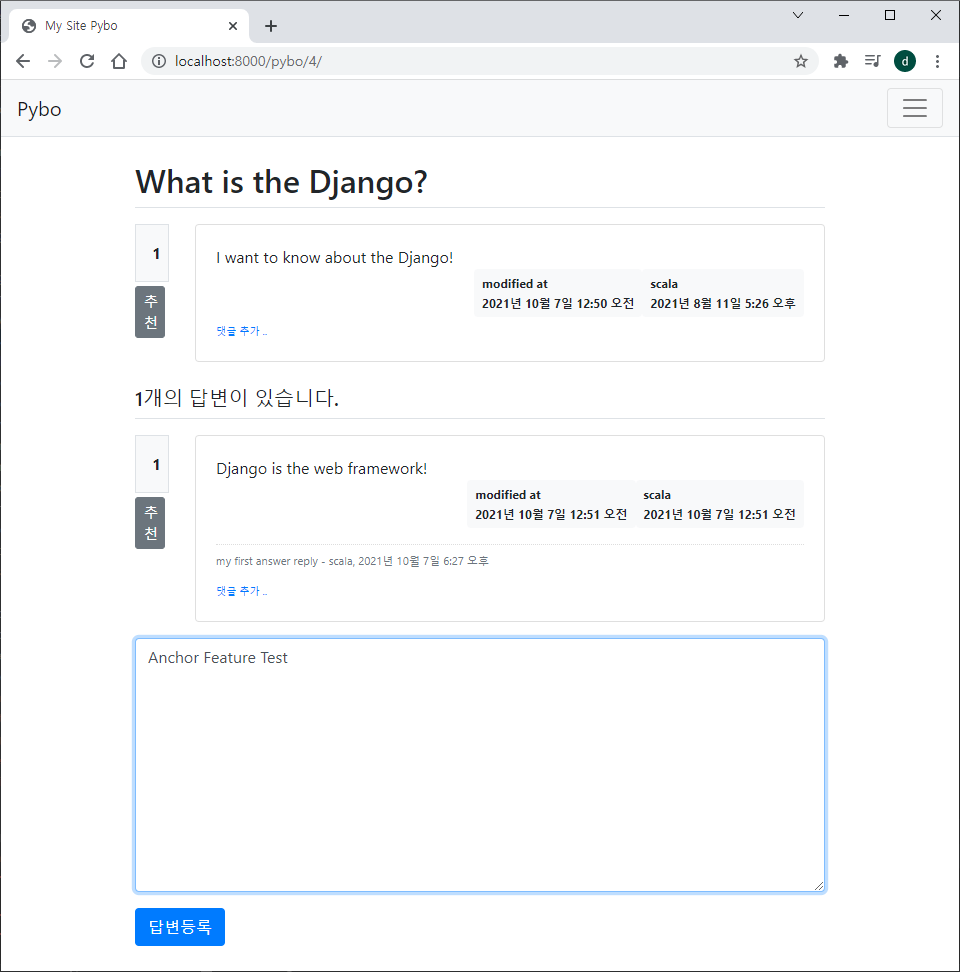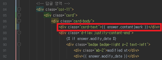 것만으로 완성이지만 redirect 시에 question_id 를 통해 게시글 상세 페이지로 이동해야 하기 때문에 answer.id 가