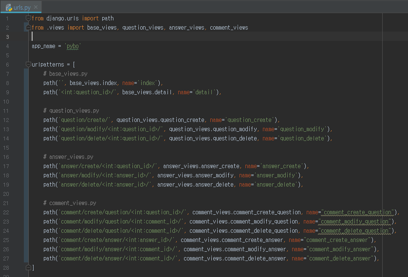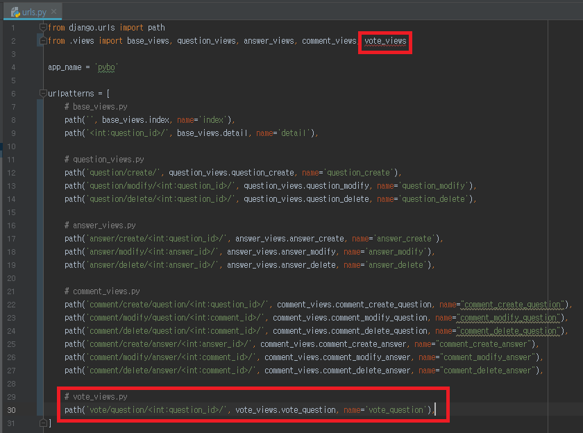 pybo/urls.py 에 vote_question 에 해당하는 url 매핑도 추가해준다. 이전 게시글에서 views.py 파일을 분리했기 때문에