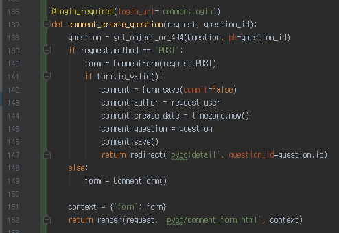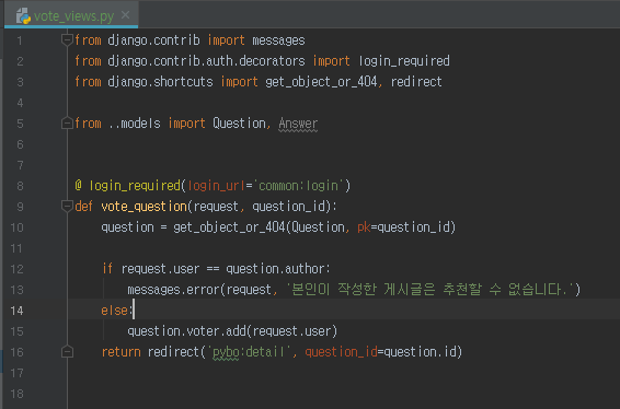 그리고 실제로 views 디렉토리에 vote_views.py 파일을 위와 같이 작성한다. 추천 또한 로그인한 사용자만이 게시글마다