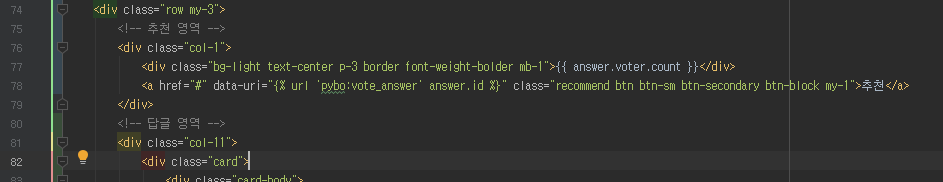 같은방식으로 작성하고 question.voter.count 를 answer.voter.count 로, data-uri 값에서 uri 매핑과 넘겨줄 id를