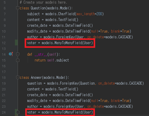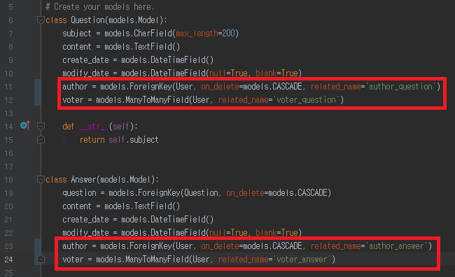 pybo/models.py 에서 Question, Answer 모델에 voter 속성을 추가한다. 그런데 저상태로는 마이그레이션 시에 에러가 발생한다. User 모델에 연결된 속성이 author 와 voter 로 두 개이기 때문에 User 모델을 통해 Question 이나 Answer