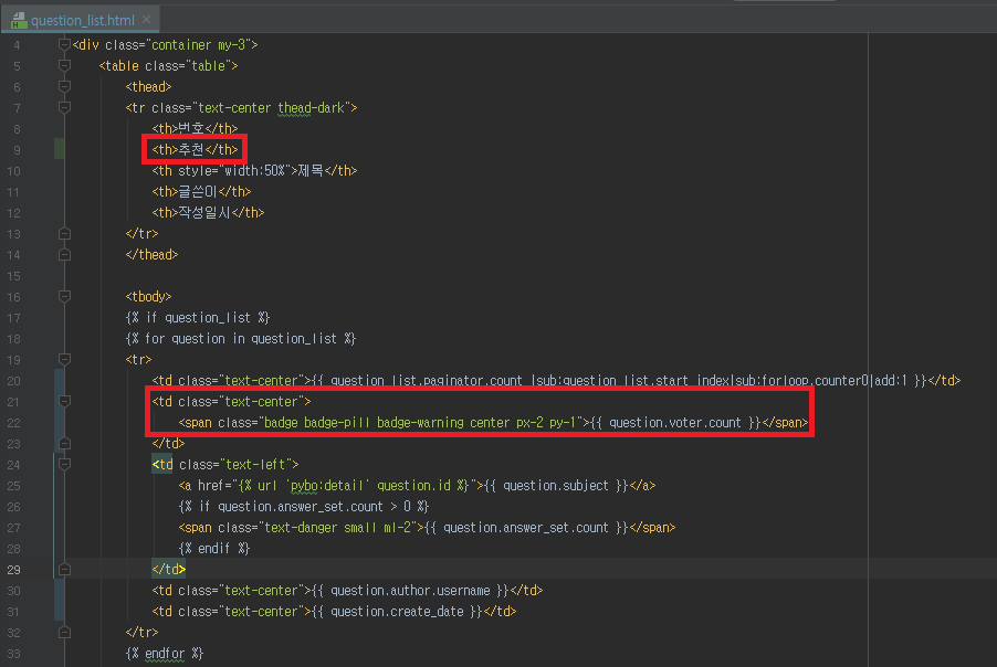 question_detail.html 에서 테이블 헤더에 추천 항목을 추가하고 badge 형태로 question.voter.count 를 표시하도록 한다.