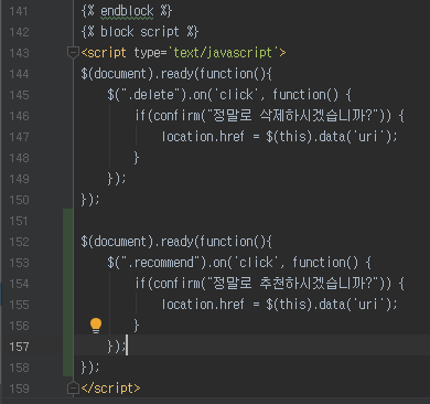 정말 추천할것인지 확인창을 띄울 것이다. 삭제를 위해 만들었던 코드에서 메시지 내용을 수정하고 .delete 를