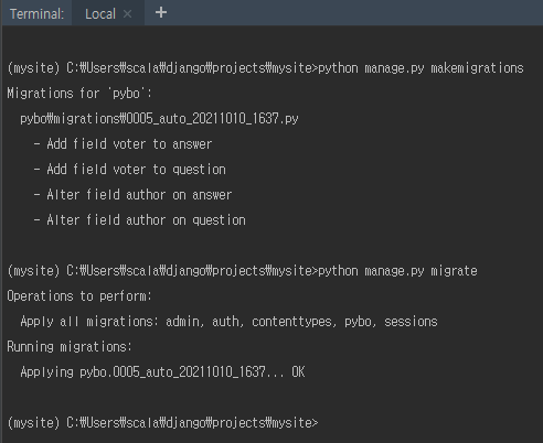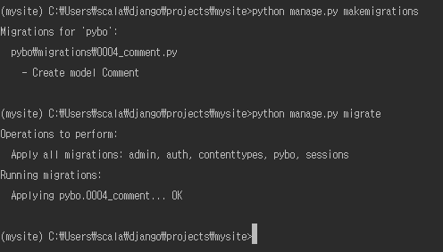 모델 수정이 완료되었으니 makemigrations 와 migrate 명령어를 실행하여 마이그레이션을 수행해준다.