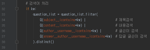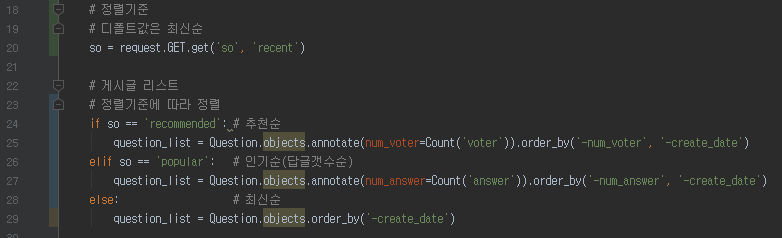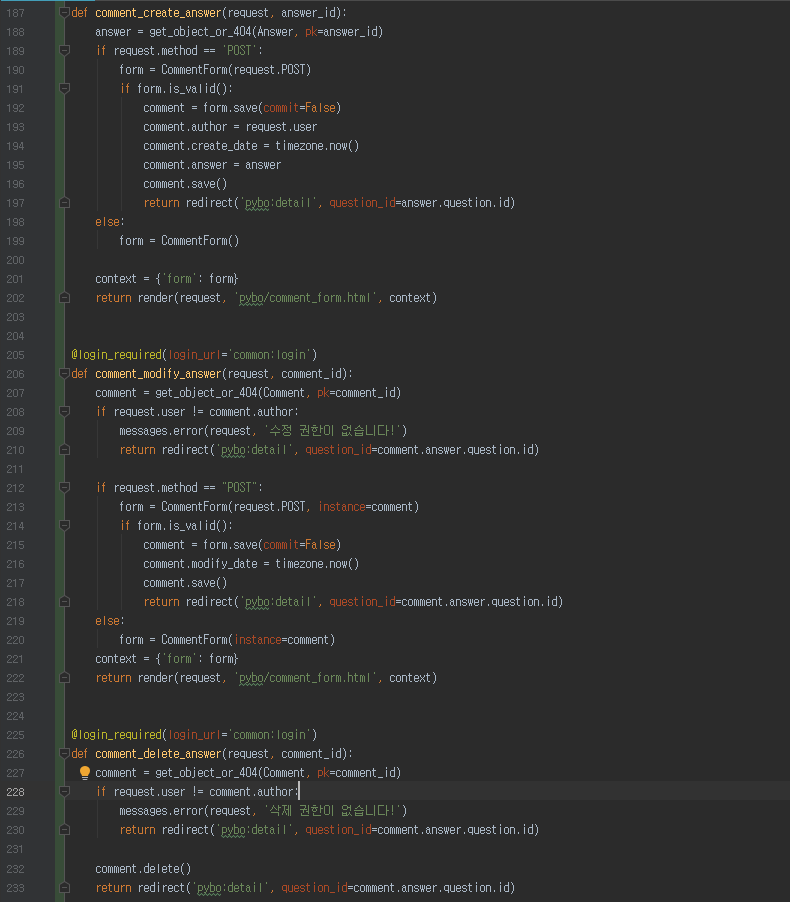 vote_views.py 에 vote_answer 함수를 위와 같이 구현해준다. 게시글 추천 함수에서 question 을 answer 로 바꿔주는