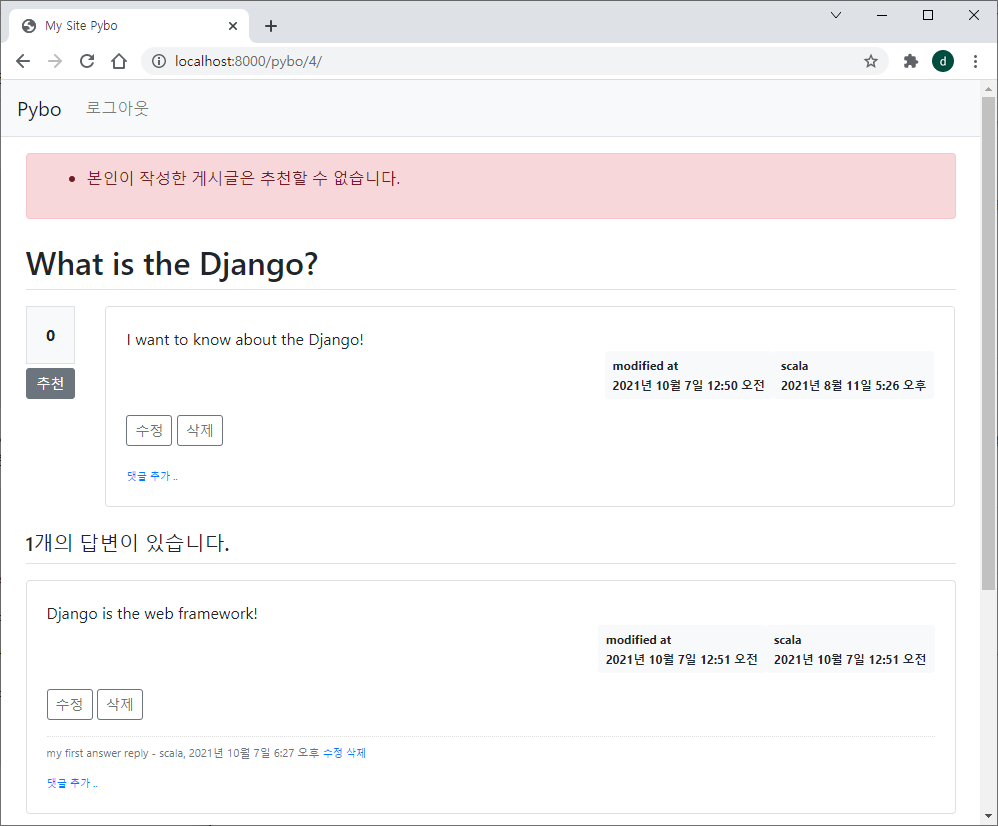 본인의 게시글을 추천할 경우 에러메시지가 표시된다.