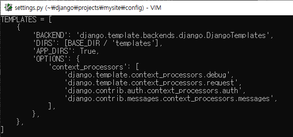 이제 데이터를 넘겨줄 템플릿을 실제로 만들어야한다. 우선 템플릿들을 저장할 templates 디렉토리를 mysite 디렉토리 하위에 생성한다. pybo 디렉토리 내에 templates 디렉토리를 생성해도 되고 그렇게하면 별도의 설정없이도 django에서 템플릿 디렉토리로 인식하지만 여러 앱이 공유하는 템플릿의 위치 문제등을 고려하면 화면을 구성하는 템플릿들은 하나의 디렉토리에 모아두는게 좋다고 한다. 그러니 여기서는 mystie 하위에 templates 디렉토리를 생성하고 그 내부에 각 앱들의 템플릿을 모아둘 디렉토리를 생성한 뒤 config\settings.py에서 템플릿 디렉토리로 등록해준다.