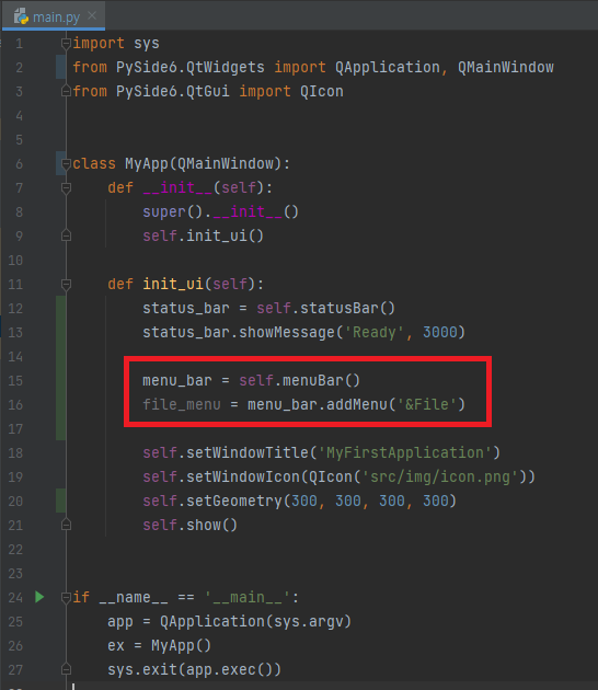 MyApp 위젯에 menuBar 메소드를 호출하여 메뉴바를 만들고 addMenu 메소드를 호출하여 File 이라는 메뉴를