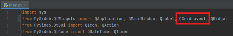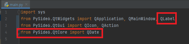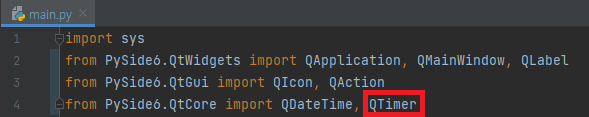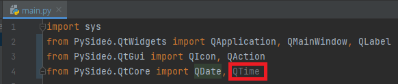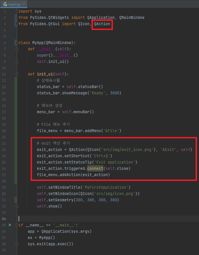 이제 File 메뉴에 액션을 추가해보자. QAction 클래스를 import 하여 프로그램을 종료하는 액션을 생성한다.